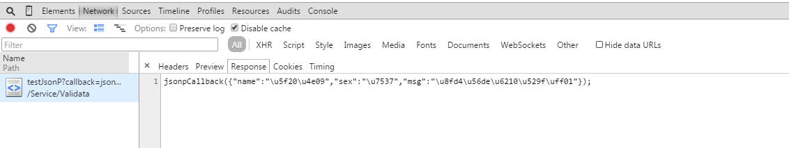 http://91hx.xicp.cn:8989/Service/Validata/testJsonP?callback=jsonpCallback callback后面的名字要传给服务器的 后端拼装成一个js回调函数 这样前台json数据就作为回调函数的参数传入 获取到数据了