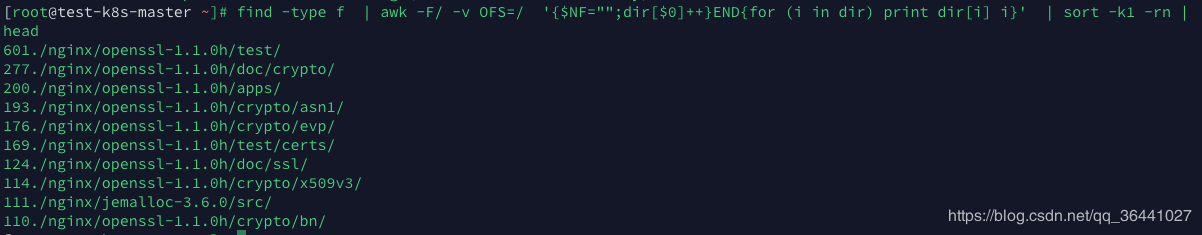 通过find找出指定文件类型的文件,然后管道给 awk,它可以把文本内容按行进行格式化输出并展示,-F / 指定处理文件时字符串之间以 / 进行分割,-v OFS=/ 表示文件显示结果时以 / 进行分割展示。对于awk命令整体规则而言有一个 {} END {} 格式,前面的 {} 表示行处理操作,END{} 表示行处理后需要进行整体结果出,在行处理操作逻辑中,设置$NF 为空表示将每一行的文件名信息去除,从而只保留目录路径,dir 是一个自增数组,用于统计结果。最后通过 for 循环进行遍历输出dir关联数组中所有行信息。