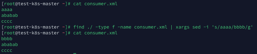 通过find命令查找当前目录下的所有子文件夹名称为 consumer.xml 的文件,然管道给 sed ,通过-i把文件内容替换。
