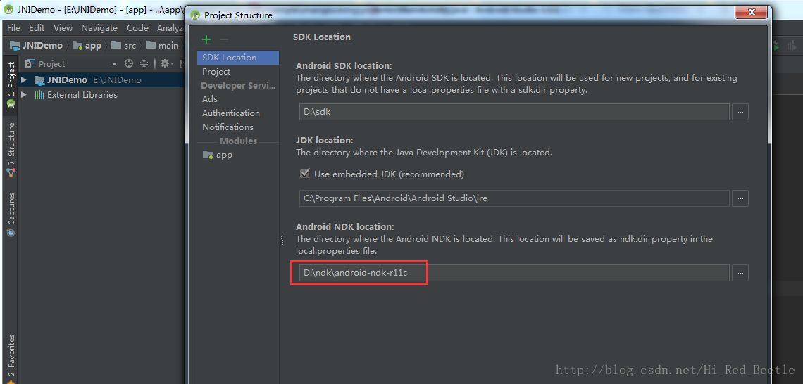 2.在AS中为你的项目配置NDK。首先新建一个Android工程JNIDemo,Ctrl + shift + alt + s打开Project Structrue把我们刚才下载好的NDK配置进去,点击OK。