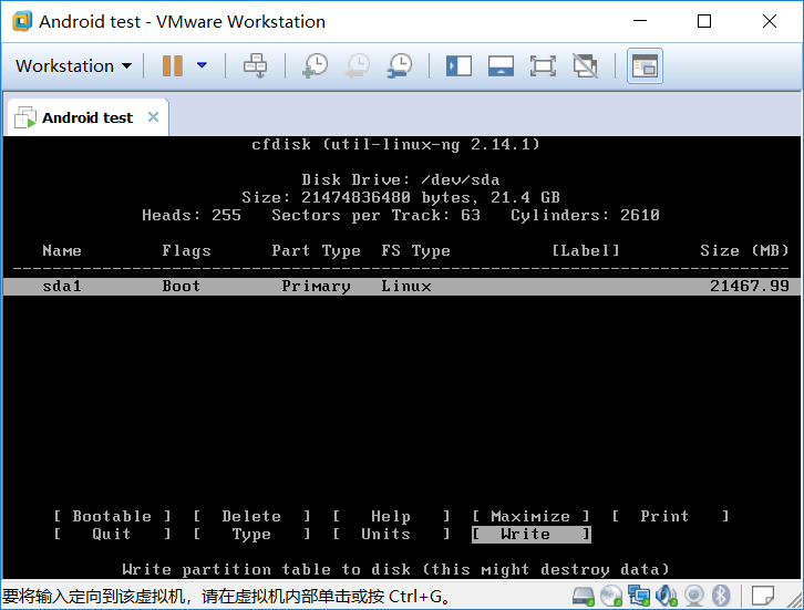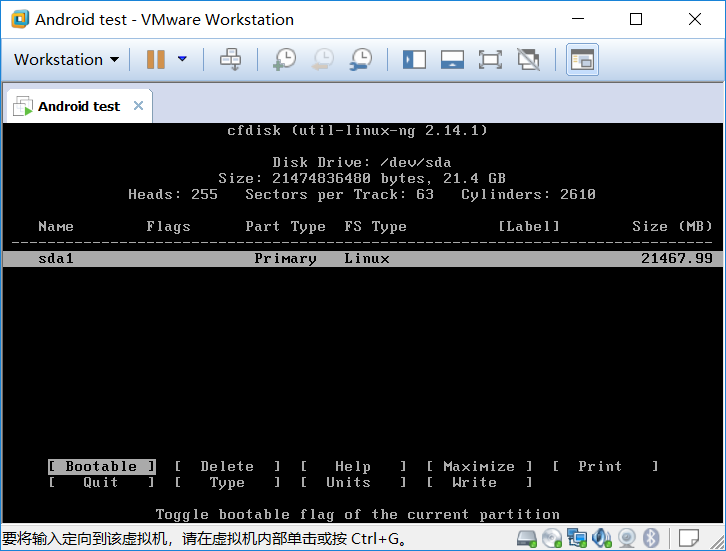 新建了主分区后需要激活分区才能启动,也就是写磁盘引导信息,选择“Bootable”然后回车。“sda1”的Flags就是“Boot”。
