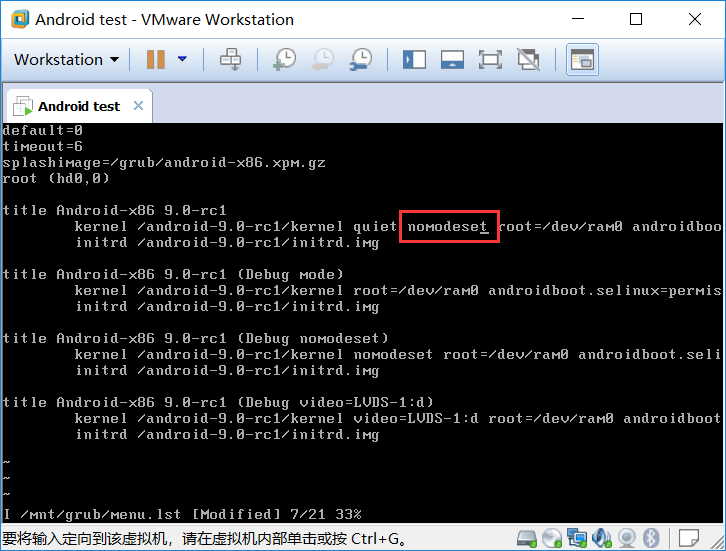 修改/mnt/grub/menu.lst, 加入nomodeset选项,输入:vi /mnt/grub/menu.lst回车,