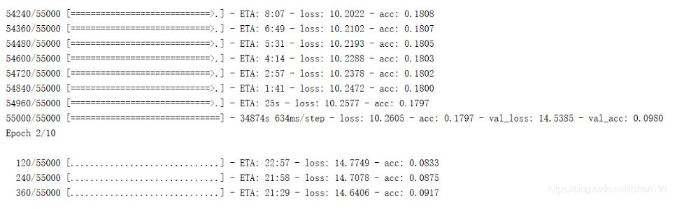 按照公开的模型框架,Alexnet只有第1、2个卷积层才跟着BatchNormalization,后面三个CNN都没有(如有说错,请指正)。如果按照这个来搭建网络模型,很容易导致梯度消失,现象就是 accuracy值一直处在很低的值。 如下所示。