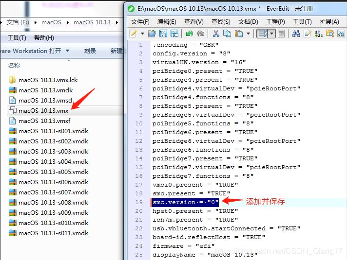先别打开虚拟机,找到macOS虚拟机的安装目录,用记事本打开macOS10.13.vmx添加并保存。