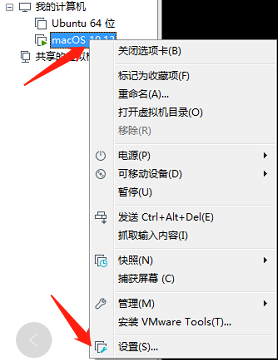 2.选中当前macOS虚拟机右键选中设置
