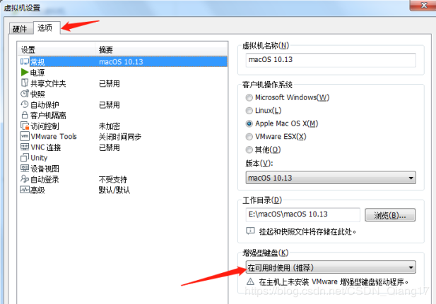 点击选项?>常规?>增强型键盘?>选择在可用时(推荐),之后保存开启虚拟机即可。