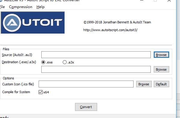4.转换成exe文件:打开autoit安装目录下的应用程序:Compile Script to .exe (x86)或者Compile Script to .exe (x64)