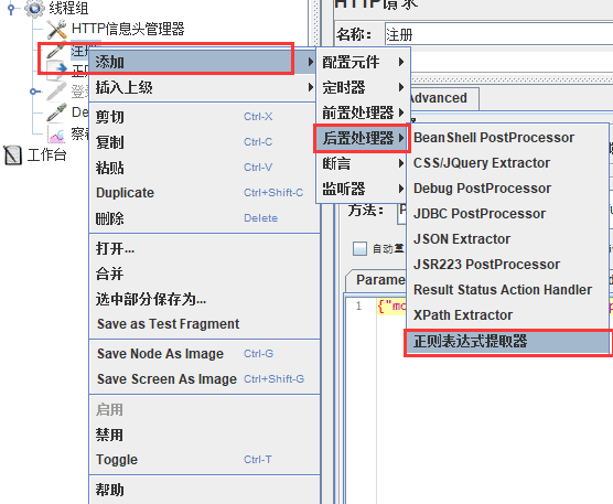 1)在当前接口下,添加-置处理器-正则表达式提取器