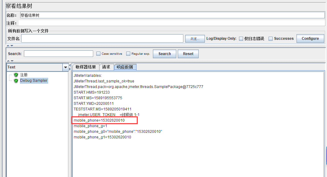 添加查看结果树(此处省略),进行注册请求并查看Debug Sampler结果