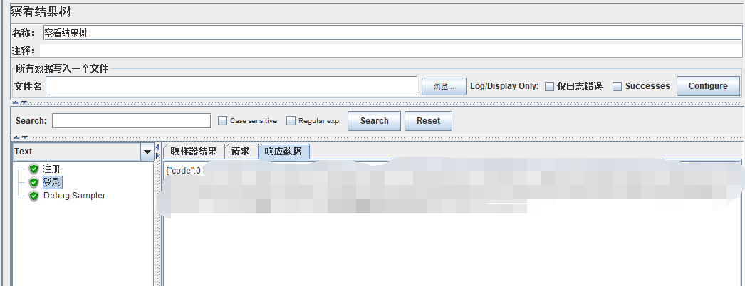 运行测试脚本,在察看结果树中 查看到已经登录(登录code为:0):