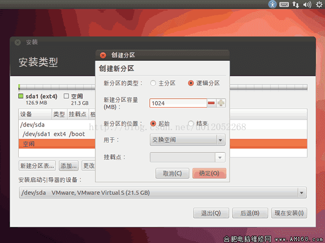 第二步:选中空闲的磁盘空间,点击“添加”按钮,弹出“创建新分区”对话框,新分区的类型为逻辑分区,“用于”选择“交换空间”,新建分区容量为1024M,最后点击“确定”按钮,如下图所示。