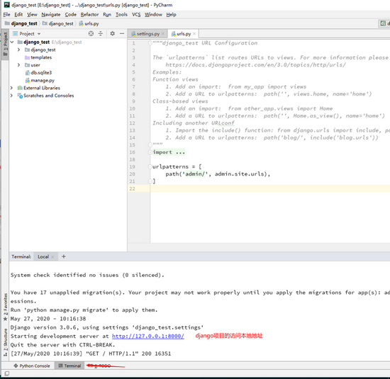 创建完成后,我们可以看看django项目是否可以启动