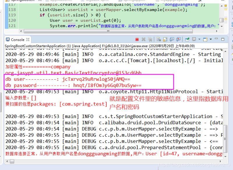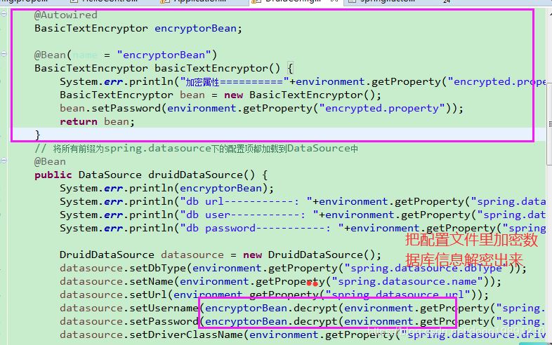 3. 编写配置类就是Spring里的标有@Configuration注解的类,然后解密配置文件里的数据库用户名和密码(就是上图中的敏感属性字段)