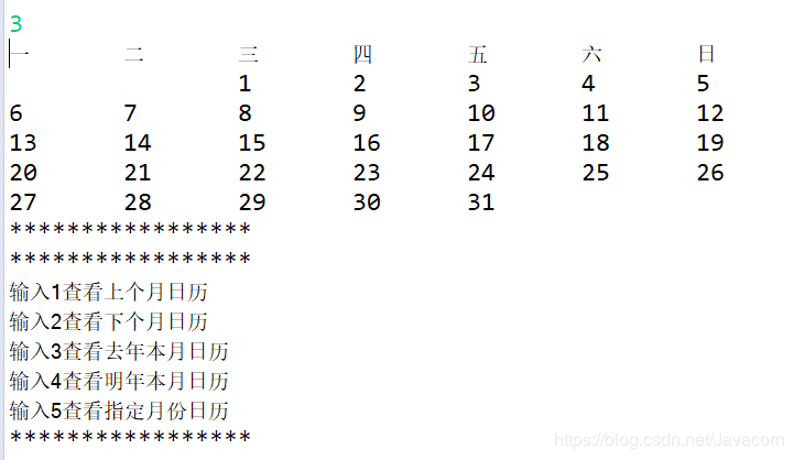 System.out.println("输入3查看去年本月日历");