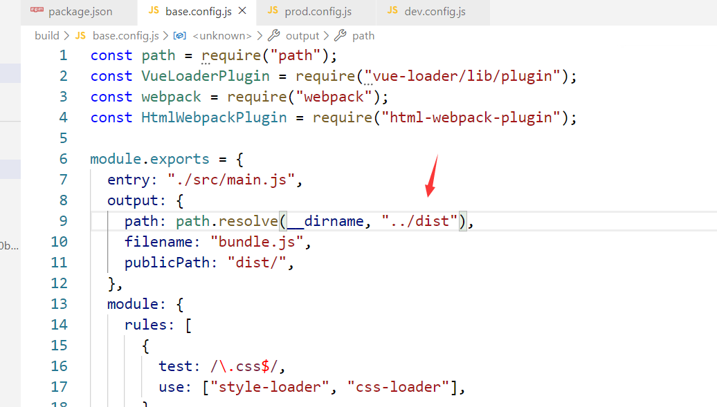 此时打包后的文件会在build目录下的dist目录中,如果还是想生成到项目目录下的dist目录中,就需要修改base.config.js中的路径