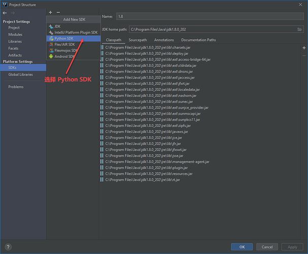 如果你的系统中已经安装过了 Anaconda,那么 SDK 被 IntelliJ 自动识别。