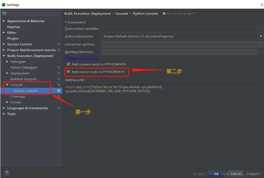 1. 进入设置,找到Console下的Python Console,勾选选项“Add source roots to PYTHONPAT”
