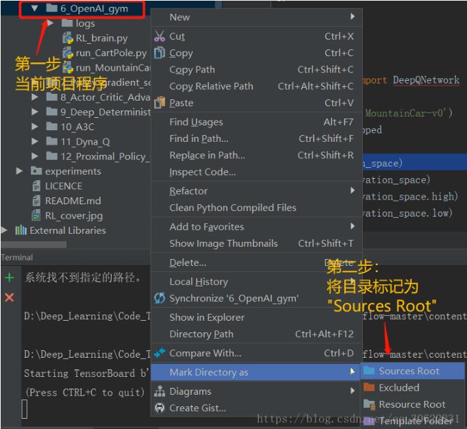2. 在当前项目程序目录右键单击,然后“Mark Directory as”为“Sources Root”。之后当前程序所在目录颜色会变化,表示已经完成标记。