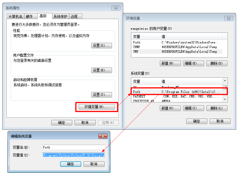 安装需要用到pip工具,该工具在3.5版本的python中已经自带不用另行安装,但是需要在系统变量中添加python下的Scripts文件夹,如下图: