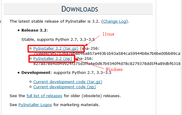 ↑如上图在Downloads中可以看到最新版本PyInstaller,上面是linux用的,下面是Windows用的。