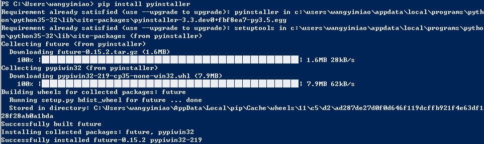 #后面的路径为你的python文件的位置(如果第一步没有添加变量,这里还是要到Script下执行pyinstaller.exe文件)