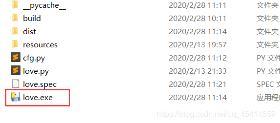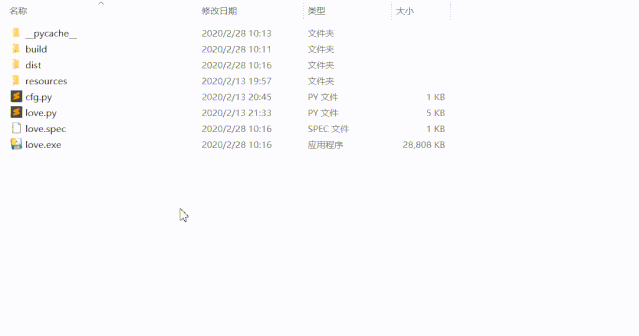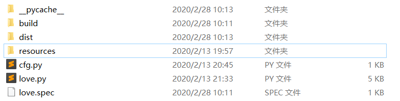其中love.py是主程序,cfg.py是配置文件,resources文件夹里是一些类似字体,音乐等的素材文件。