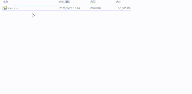 原因很简单,因为你没把相关的素材文件打包进这个exe文件,而在该目录下根据程序本身的设定是无法读取到这些素材文件的。你需要先把该exe文件移动到love.py这个主程序所在的目录,然后双击运行: