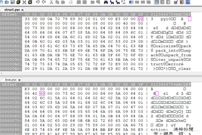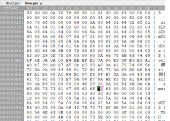 把struct.pyc文件里的前12个字节复制到love.pyc文件里,love.pyc文件变成了这样: