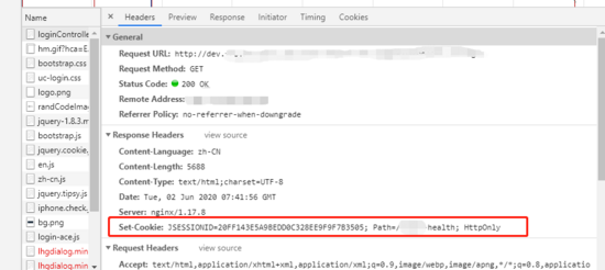 浏览器访问 http://www.domian.com/health-dev 时,服务端返回的 Set-Cookie 的 Path 值为 /health (因为中间有反向代理,服务端并不知道代理前的路径是啥,是按最终请求服务端的路径设置),如图