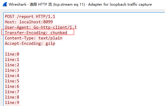 按照对源码的理解,可以得知在使用 io.pipe() 方法进行流式传输时,会使用 chunked 编码进行传输,通过以下代码进行验证: