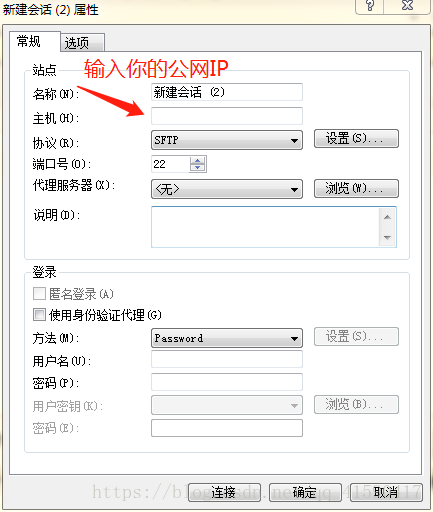 打开Xftp新建会话,然后在主机输入你的阿里云服务器公网IP,下面的账号密码可以先不输入,点击确定后会提示你输入。