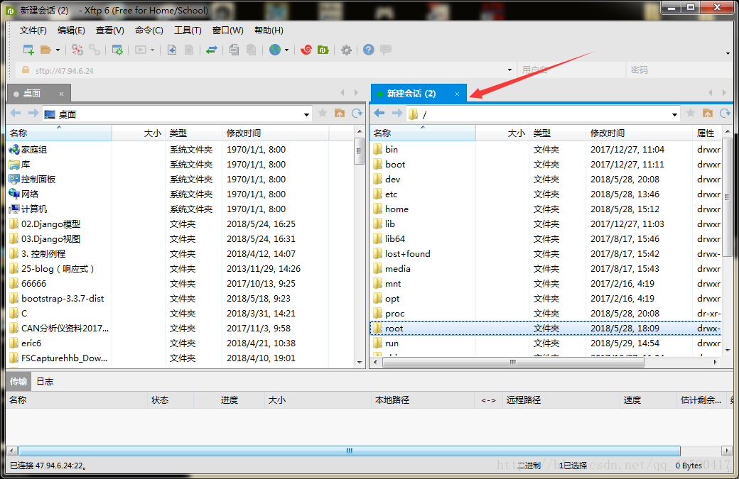 这个左面显示的是你的桌面,右面新建会话显示的就是阿里云服务器上Ubuntu系统的目录结构,在这里我们可以直接从左面(你的本地桌面)往右面(阿里云的Ubuntu系统)拖拽文件,这个在后面我们部署的时候会非常方便!