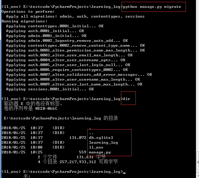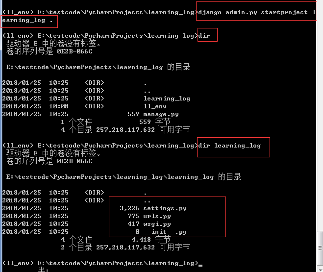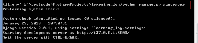 命令:django-admin.py startproject learning_log .(让Django新建一个名为learning_log的项目)