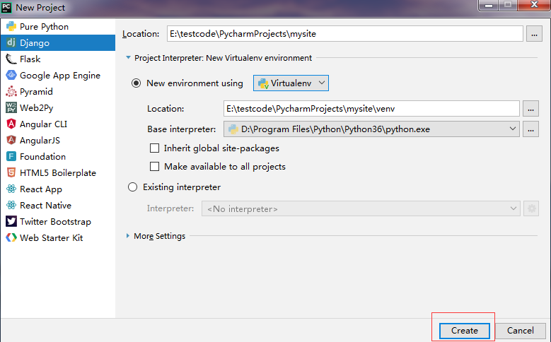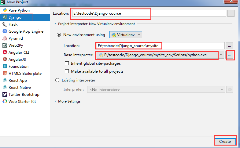 按图示在左侧选择Django,然后将工程Location设置在虚拟环境同一级的目录内,也就是E:\testcode\Django_course,工程名字使用国际惯例mysite。在右侧的interpreter选择标处点选择,然后在弹出的界面中,找到我们刚才建立的虚拟环境所在位置,最后确定