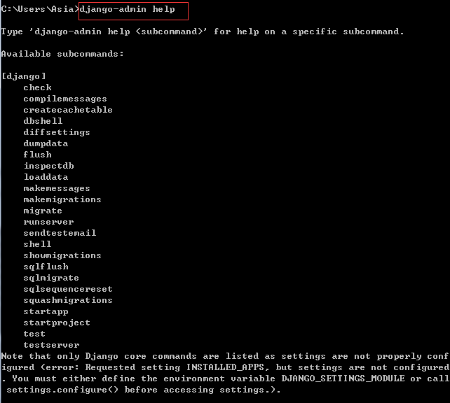 回到cmd界面,运行django-admin help,能看到下面的内容表示环境变量设置成功