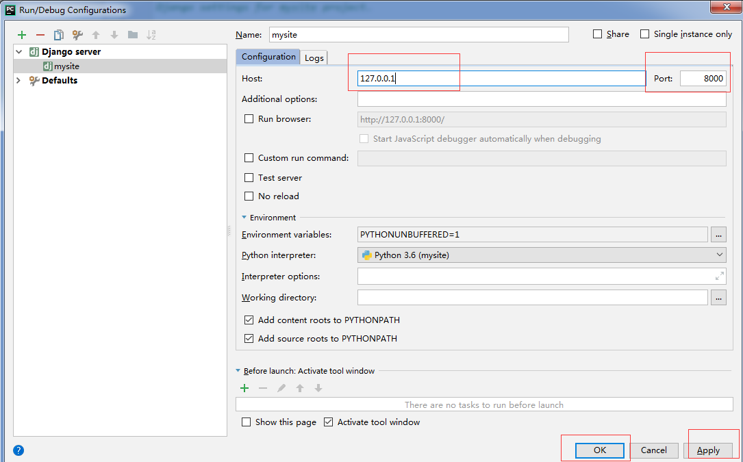 点击edit configurations,在host中填入127.0.0.1,port中填入8000。OK确定web服务就运行了