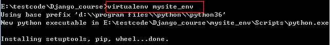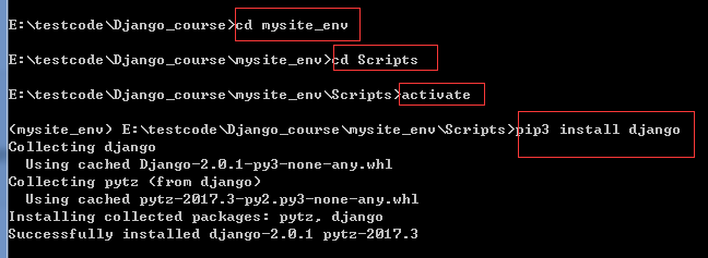 在Windows的CMD中,进入指定的目录,这里是Django_course。使用下面的方式,建立一个mysite_env虚拟环境
