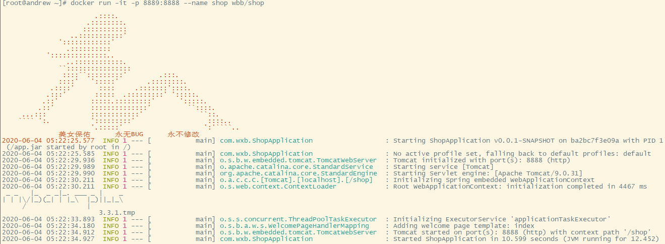 2、启动容器:docker run -it -p 8889:8888 --name shop wbb/shop