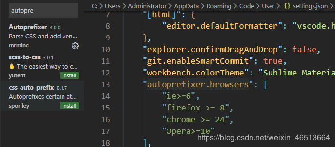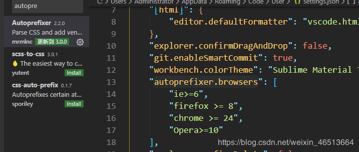 (打开设置->搜索autoprefixer->点击在setting.json里编辑)