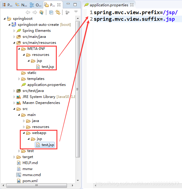 (1)可以在resources目录下新建一个 META-INF 目录,然后在 META-INF 目录下创建一个resources目录,然后把需要的jsp页面放在这个目录下面,接着在application.properties 配置文件中配置一下访问路径,就可以访问到jsp文件了: