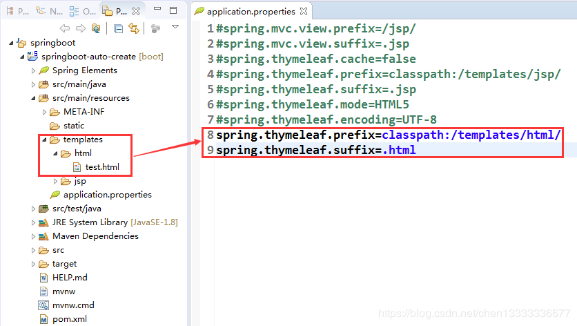 2.在 application.properties 文件中配置 thymeleaf 相关属性值,最后在 templates 目录下创建html文件就可以了: