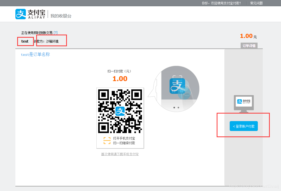 由于这个是沙箱环境,所以这个二维码无法识别,我们选择右边的登录支付宝账户付款