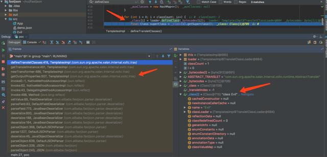 如上图所示的攻击调用栈信息,可以看到和TemplatesImpl调用链完全吻合,最终还是通过defineclass加载了bytecodes[]导致了命令执行。