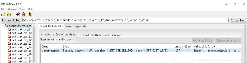 resnet50_v2 这个权重文件,仅一个attr “layer_names”, 该attr包含177个string的Array,Array中每个元素就是层的名字(这里是严格对应在keras进行保存权重时网络中每一层的name值,且层的顺序也严格对应)。