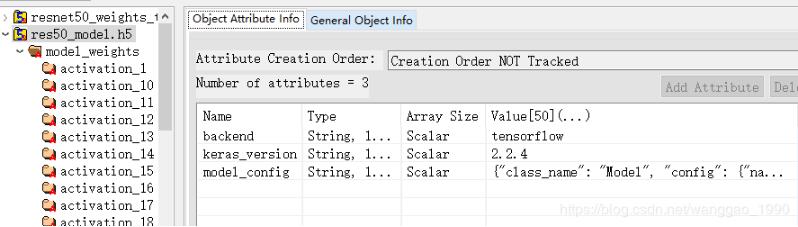 >>> ff <HDF5 file "res50_model.h5" (mode r)> >>> ff.attrs.keys() <KeysViewHDF5 ['backend', 'keras_version', 'model_config']> >>> ff.keys() <KeysViewHDF5 ['model_weights']> >>> ff['model_weights'].attrs.keys() ## ff['model_weights']有三个属性 <KeysViewHDF5 ['backend', 'keras_version', 'layer_names']> >>> ff['model_weights'].keys() ## 无顺序 <KeysViewHDF5 ['activation_1', 'activation_10', 'activation_11', 'activation_12', …, 'avg_pool', 'bn2a_branch1', 'bn2a_branch2a', 'bn2a_branch2b', …, 'bn5c_branch2c', 'bn_conv1', 'conv1', 'conv1_pad', 'fc1000', 'input_1', …, 'c_branch2a', 'res5c_branch2b', 'res5c_branch2c']> >>> ff['model_weights'].attrs['layer_names'] ## 有顺序 array([b'input_1', b'conv1_pad', b'conv1', b'bn_conv1', b'activation_1', b'pool1_pad', b'max_pooling2d_1', b'res2a_branch2a', b'bn2a_branch2a', b'activation_2', b'res2a_branch2b', ... 省略 b'activation_48', b'res5c_branch2c', b'bn5c_branch2c', b'add_16', b'activation_49', b'avg_pool', b'fc1000'], dtype='|S15')