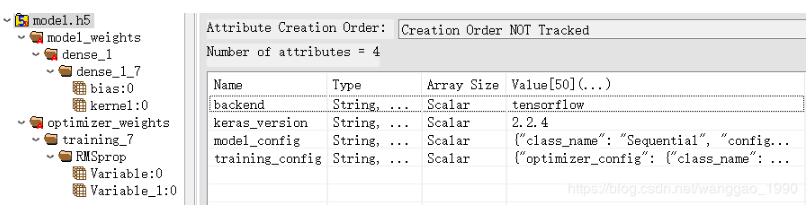 例如,一个只有dense层的网路训练保存后查看,属性多了"training_config",键多了"optimizer_weights",如下图。