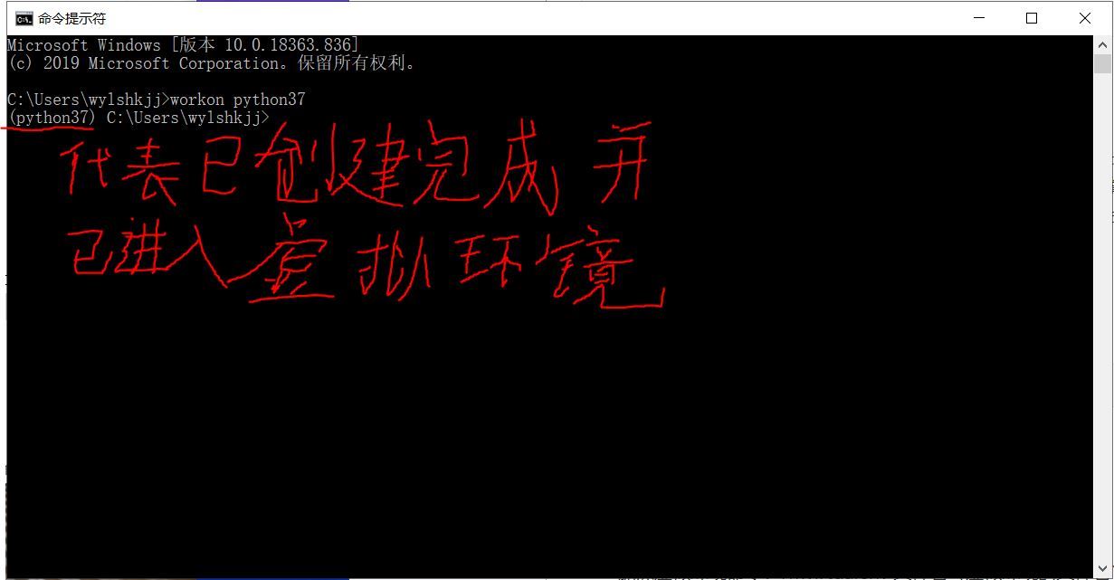 ​创建成功后会自动进入虚拟环境,由于我已创建,所以就用进入命令来模拟创建后的结果