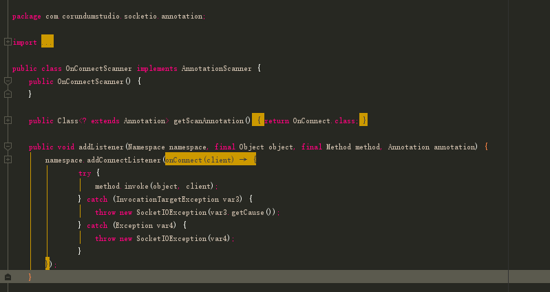 相关的源码存放在包com.corundumstudio.socketio.annotation下OnConnectScanner、OnDisconnectScanner、AnnotationScanner中:
