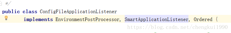 由于ConfigFileApplicationListener监听器实现了SmartApplicationListener接口,而SmartApplicationListener接口继承了ApplicationListener<ApplicationEvent>接口,所以能监听到上面广播出来的SpringApplicationEvent事件,类的继承图如下: