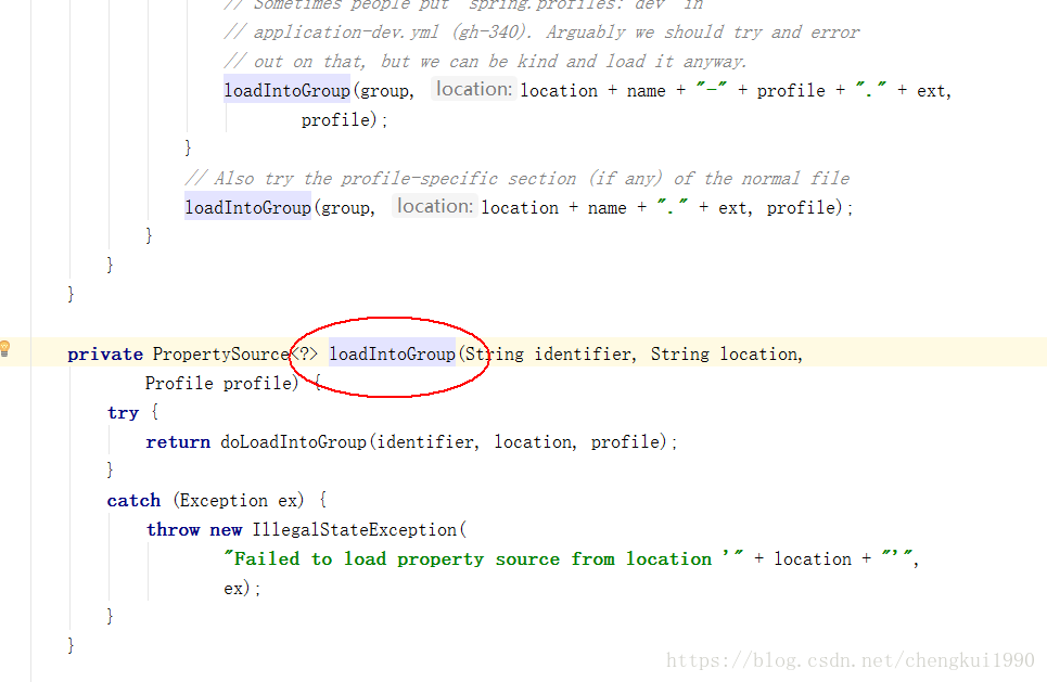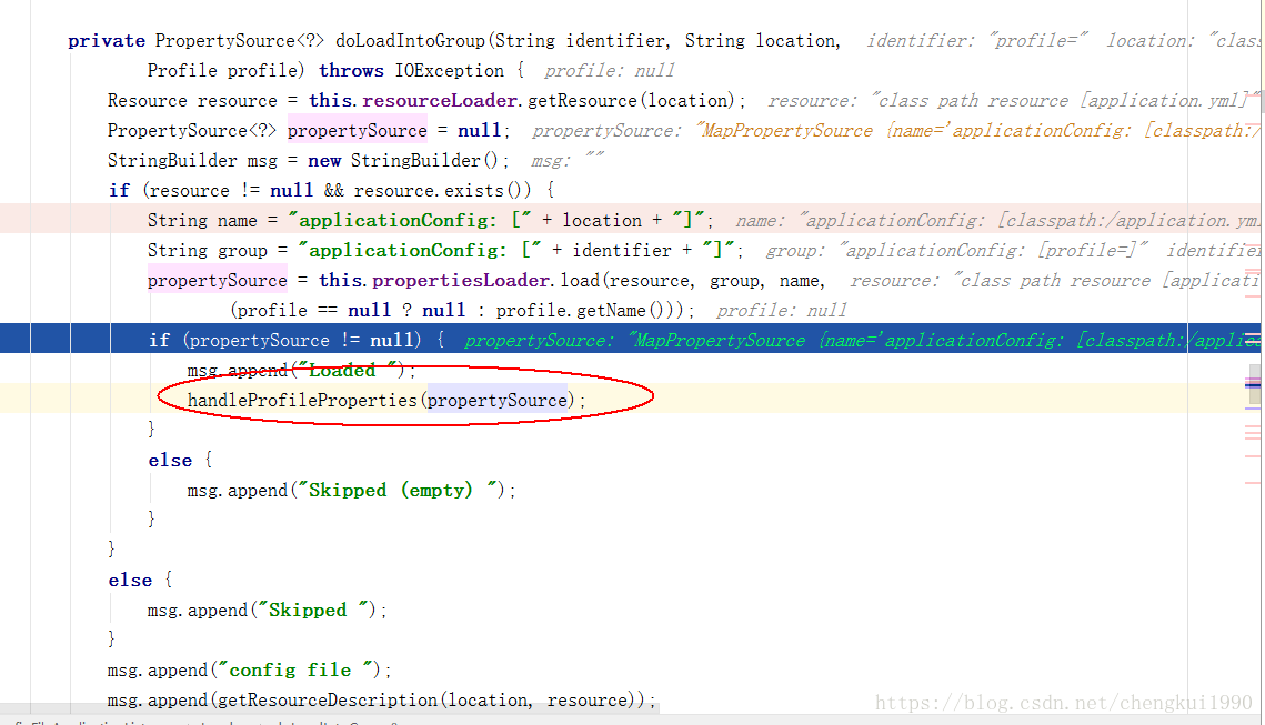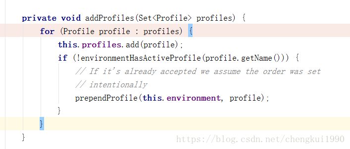 然后在读取到的配置文件的属性加载到profiles队列中重新加载配置文件,代码如下,所以任何项目都必须现有一个基础的配置文件,如application.yml,然后在这个配置文件里面有一个active属性;